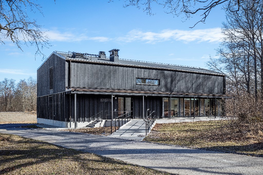 Byggnadens material och uttryck har medvetet valts i kontrast mot sjukhusområdets övriga byggnader. Den panelade träbyggnadens mörka slamfärgade fasad får den att diskret smälta in i skogsbrynet. Bottenvåningens rusticerade panel övergår till slätspont i det övre planet. Byggnaden har projekterats för klassning som Miljöbyggnad guld.